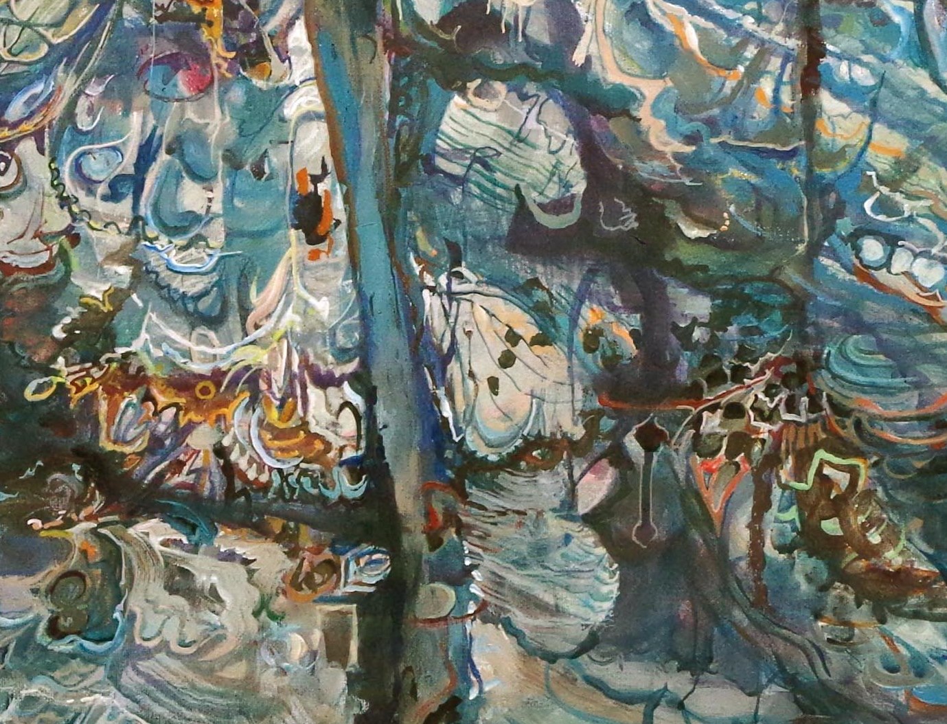 I have done a lot of this painting with small brushes; very fine detail. The Lepidopterous becomes more visible with closer inspection and so I am adding here a few details. Look for fragments of butterflies; or rather butterfly-like patterns.