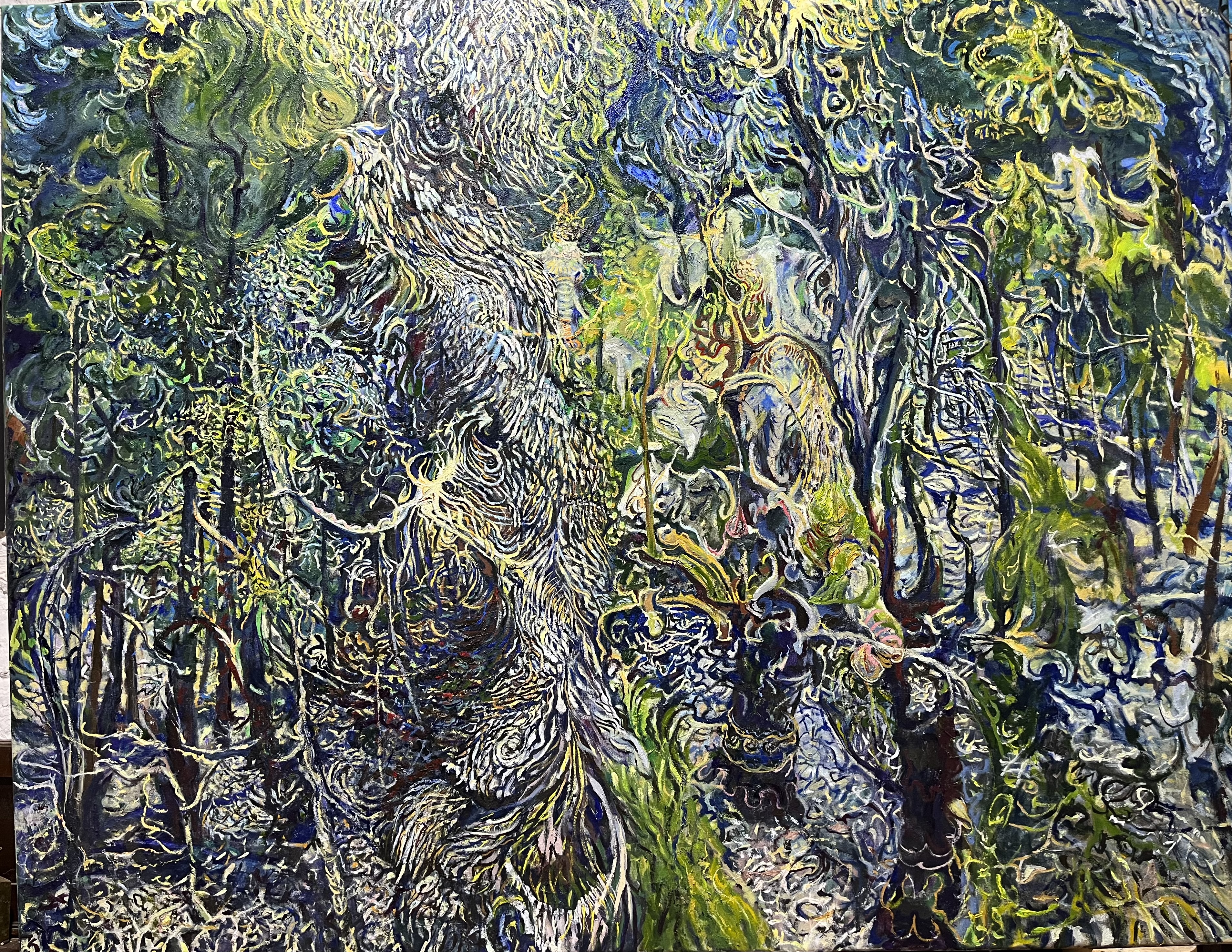 Concurrently there was the business of making all the daubs of paint look pleasing (to me that is) and carrying my message from Buddha that everything in the universe knows about and interacts with every other thing. (So much so that “things” as autonomous entities lose their individuality, nay, their very existence!)