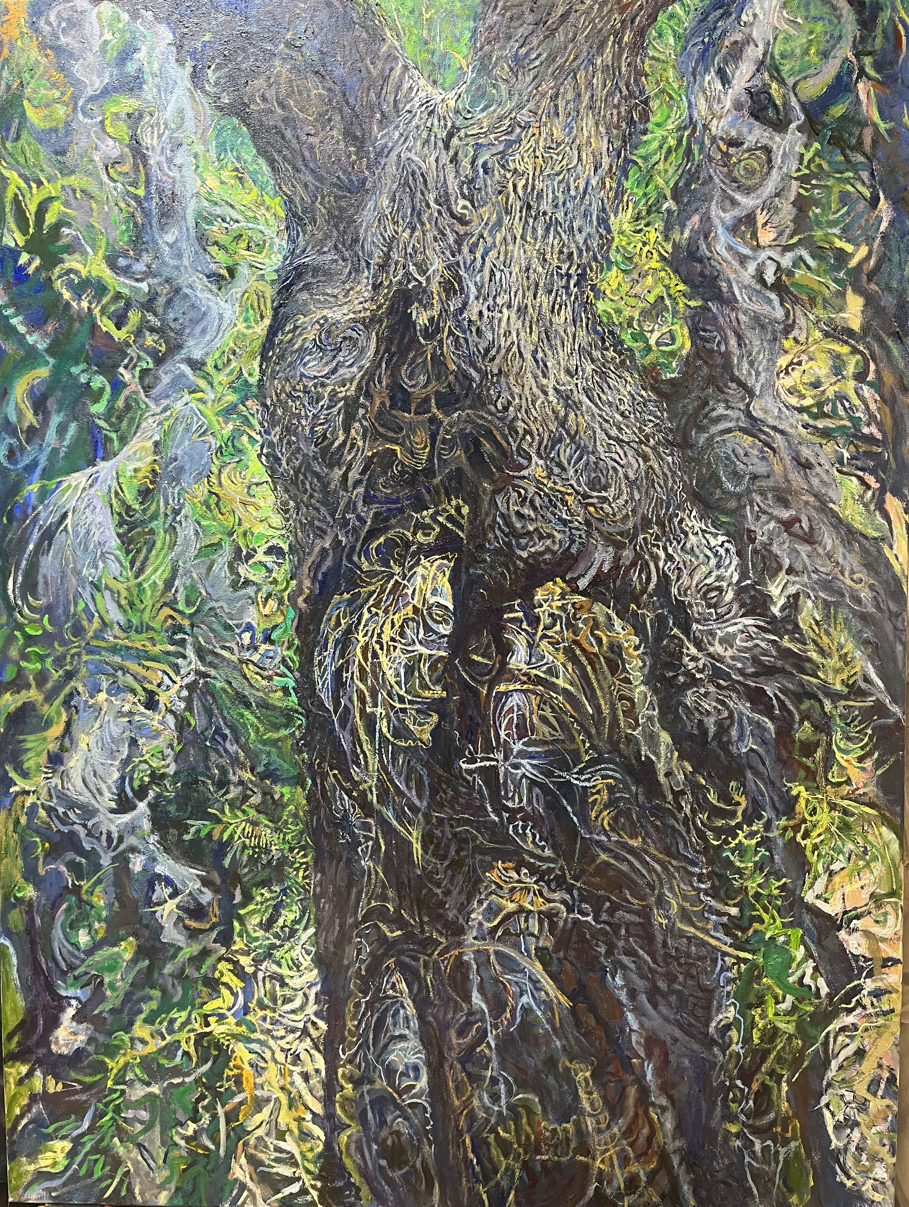 Maybe ten years ago I did a painting of a grey box tree trunk towards the light and as I played around with the patterns in the bark I managed to create an illusion of the far side of the tree coming through, as if the tree trunk was made of clear glass.