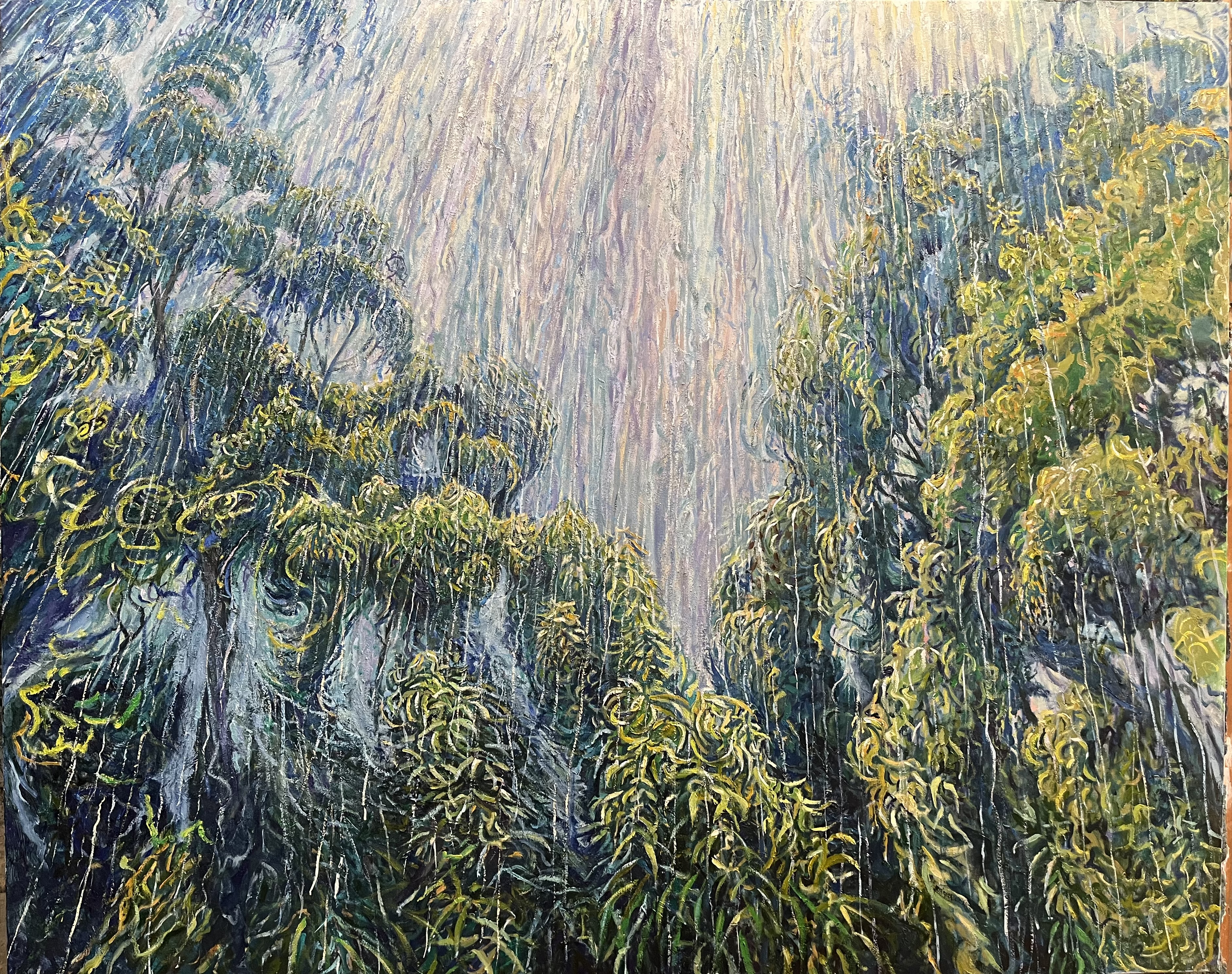 Whatever else I was hoping to convey just had to wait offstage until I got that rain coming down convincingly. Once I was more or less satisfied with the rain, I wanted to convey wetness of gumleaves.