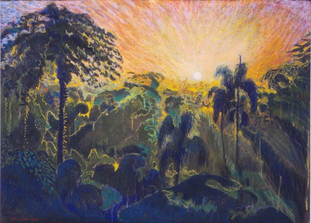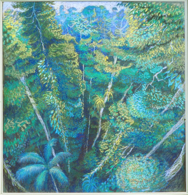 I enjoyed creating a kind of Mosque dome with bright lights in the big fig tree; and a storm coming across the rainforest. Very Romantic. It was a very difficult painting, but not for a minute unenjoyable. I love extremely hard work.